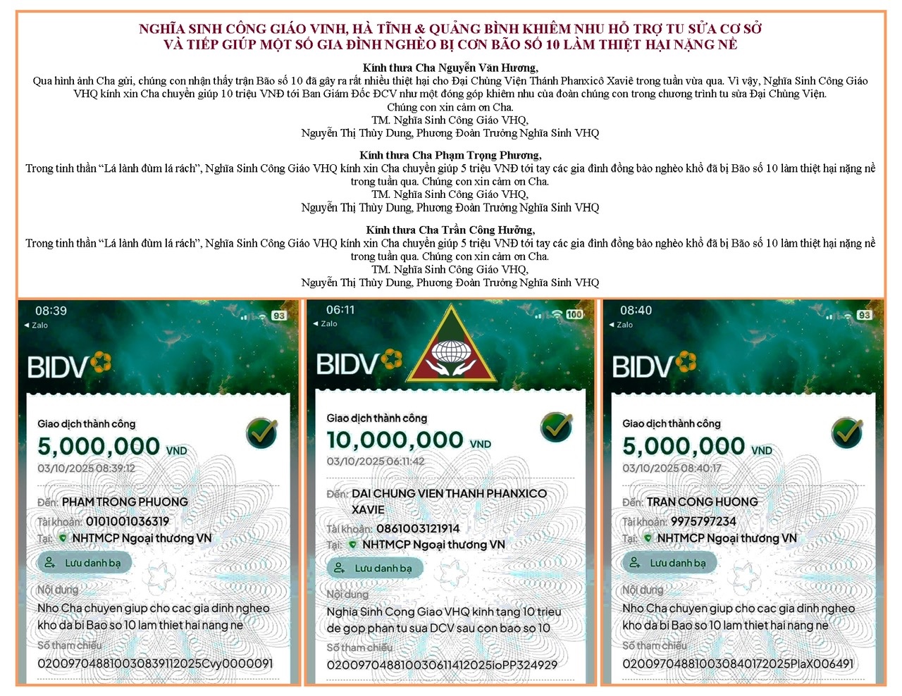 Nghĩa Sinh VHQ khiêm nhu giúp đỡ các gia đình nghèo bị Bão số 10 làm thiệt hại nặng nề